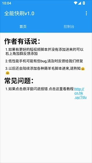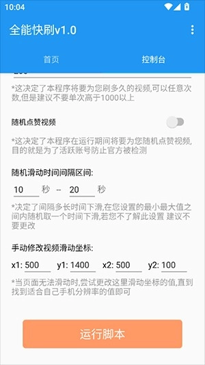 全能快刷最新版本是一款高效智能的脚本辅助工具,操作管理便捷易用。你能直接在软件内开启悬浮窗功能,便于后续随时调用,让刷视频的过程更轻松简单。软件内的各类脚本功能均可体验,服务设计简洁有趣,即使未运行脚本时也能保持安全稳定的状态。所有脚本参数都支持灵活调整,操作无门槛,可帮助用户自动完成刷视频的任务。感兴趣的用户不妨前往52pkvr平台体验一番!