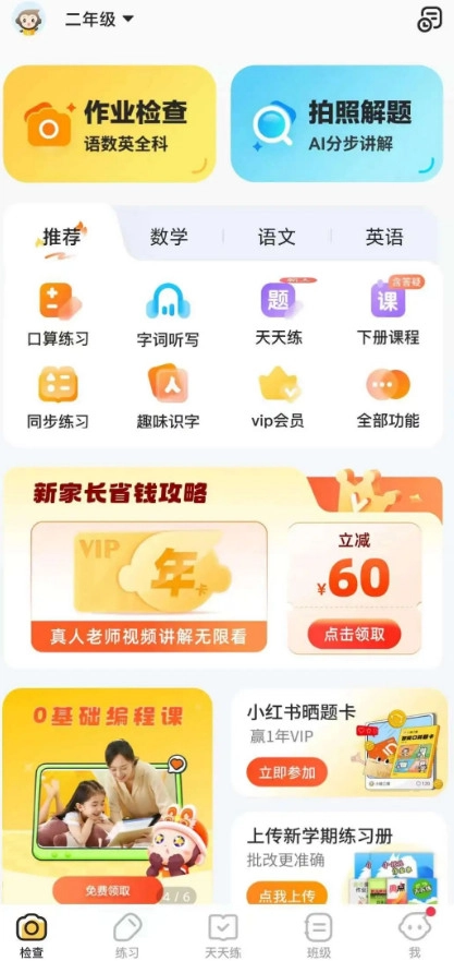 1.手机拍照,秒判对错:只需对作业拍照,一秒就能判断对错。可检查作业类型包括:小学数学(口算、填空、竖式计算等多种题型)、小学语文(单词听写、组词、近反义词等多种题型)、小学英语作业检查。