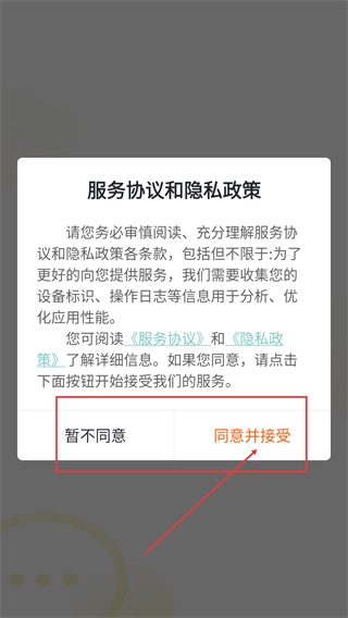 1、仔细阅读《服务协议》和《隐私政策》的各项条款后,点击【同意并接受】按钮,完成协议确认,以便继续进行后续操作。