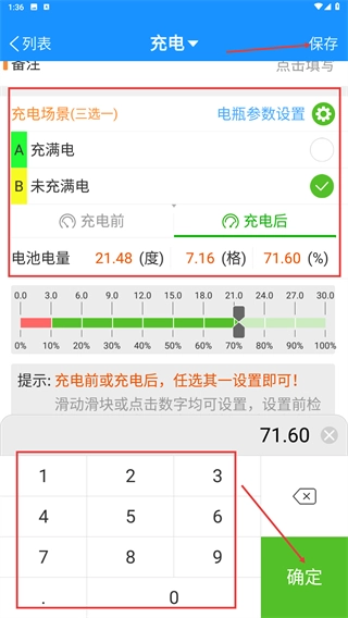 4、设置充电后电池电量参数,通过数字键盘输入数值并点击【确定】,完成后点击右上角【保存】即可。