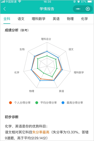 直观呈现个人得分率与整体水平的对比,并依据个人成绩对学生各科学习状况进行初步诊断。