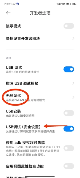 在开发者选项中启用“USB调试”和“无线调试”。对于某些设备,可能还需要在通知设置中改为“原生样式”。