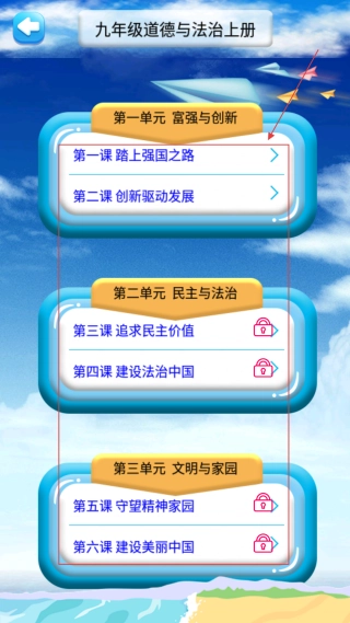 进入课程界面后,可选择九年级道德与法治上册的【单元课程】板块,学习已解锁的课文内容。