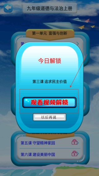 当遇到解锁弹窗时,点击【观看视频解锁】按钮即可获得课程权限,进而继续学习对应的课文内容。
