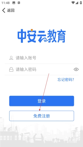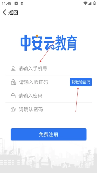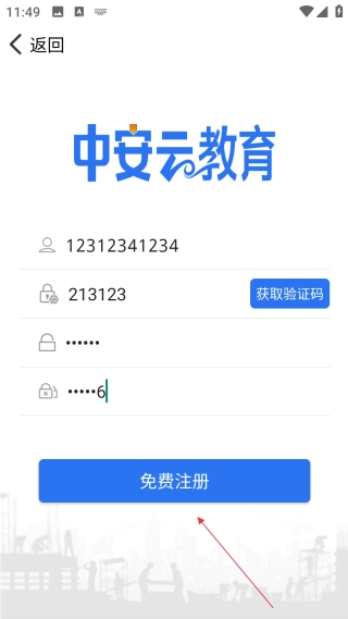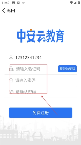 在中安云教育的登录页面,点击【免费注册】按钮,即可进入账号注册的信息填写界面。