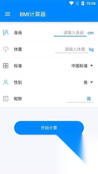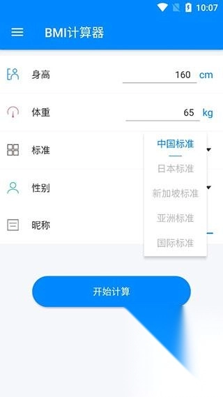 2、输入身高与体重数据,也能选择全球各地不同的标准,之后点击“开始计算”按钮。