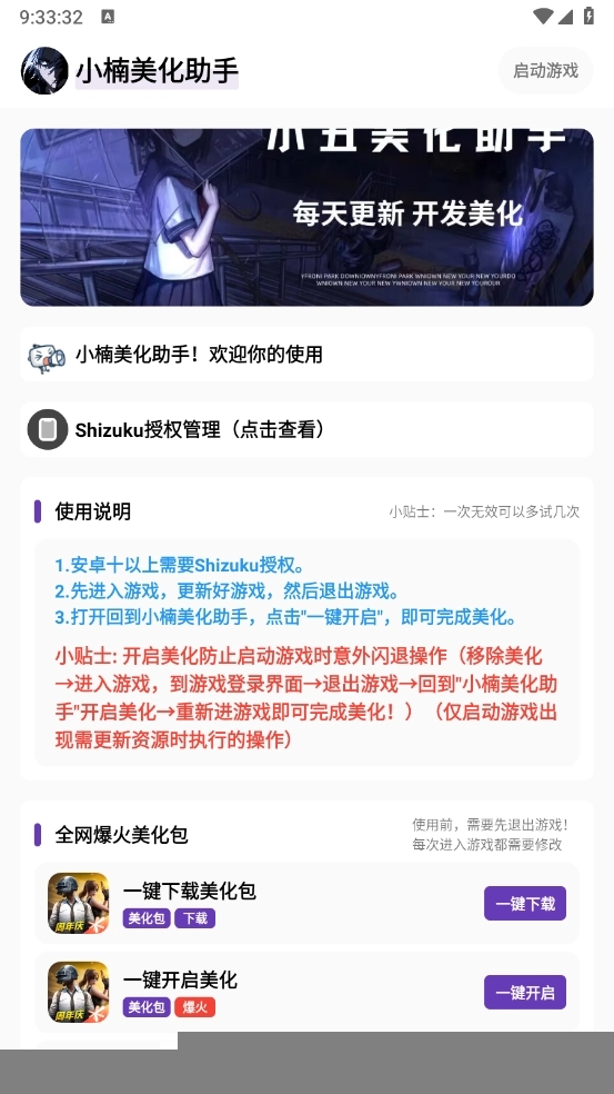 小贴士:开启美化功能以避免启动游戏时意外闪退的操作步骤如下:先移除当前美化效果,然后进入游戏直至登录界面,接着退出游戏,再回到“小楠美化助手”开启美化功能,最后重新进入游戏即可完成美化设置。
