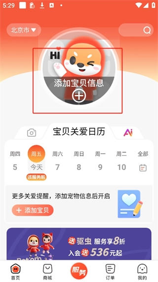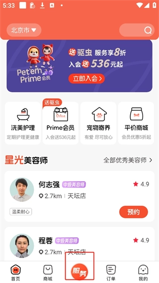 点击服务这里面可以预约上门给宠物洗澡等等