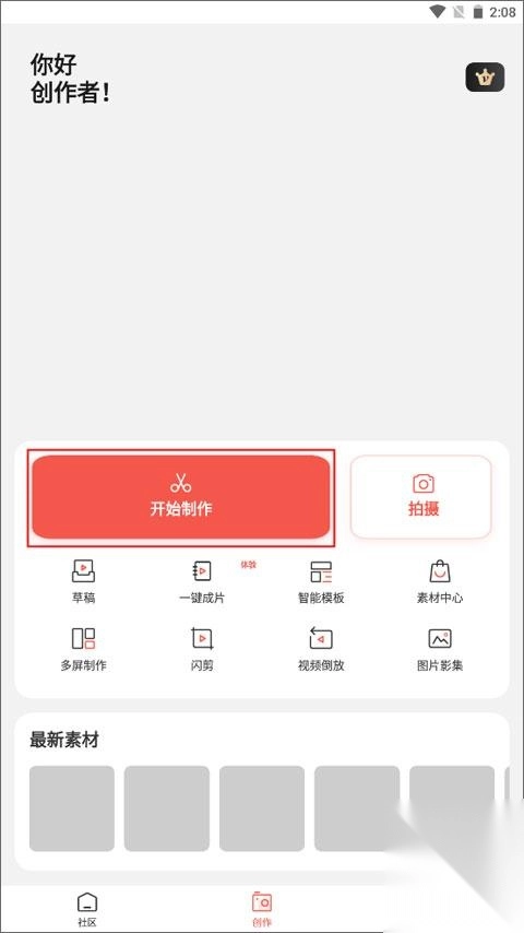 打开后默认进入【创作】界面,点击上方的“开始制作”按钮。