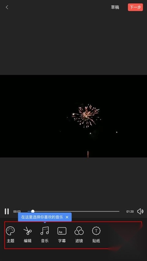 下面是用于创作视频的工具,里面包含了主题、编辑、音乐、字幕、滤镜、贴纸、配音、转场等功能。