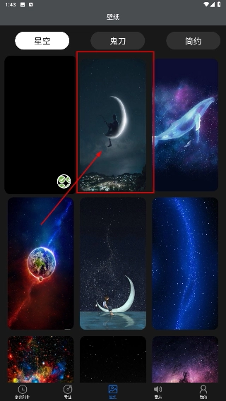 1、在壁纸页面选择目标壁纸样式(如星空类壁纸),点击进入该壁纸的预览效果界面。