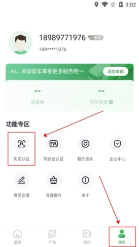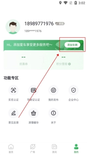 3、完成认证后就可以返回到我的页面,点击右上方的添加车辆按钮进行车辆绑定;