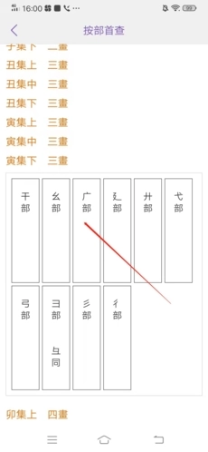 2、点击进入后,根据要查部首的笔画,我们就能轻松找到想要查的部首;