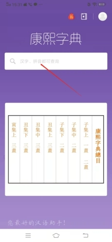 1、进入康熙字典后,点击首页中搜索栏;