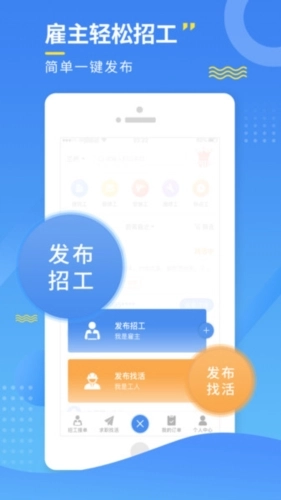 2.一键发布招工、找活,方便快捷,招聘者的贴身之宝,让找工人从此就是这么方便,工人党的福利、招聘者的助手。