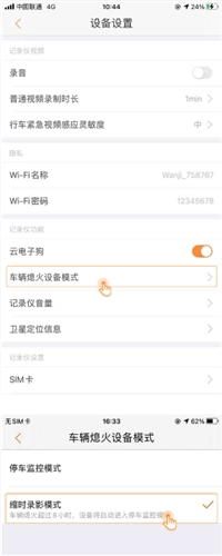 缩时摄影功能默认关闭,确保车辆为点火状态,进入小万出行-【我的】-【记录设置】-连接设备Wi-Fi(Wi-Fi名称:Wanji_XXXXXX,密码:12345678)】-【车辆熄火设备模式】-选择【缩时录影模式】