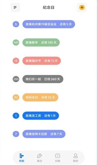 应用支持正数/倒数日期、倒计时、纪念日、生日、日程、大姨妈周期、高考倒计时、恋爱纪念日、结婚纪念日等多种事件类型,满足不同用户的需求。