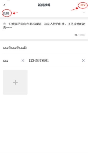 4、选择报料分类中的投稿,输入一些内容、位置和联系方式,加入拍摄的照片,提交就可以了