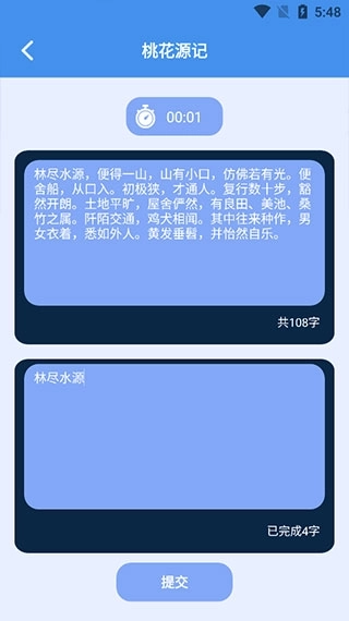 2、以“桃花源记”为例,底部设有打字显示区域,一旦开始打字,上方的计时器便会启动,以此协助校准并对比打字时间。