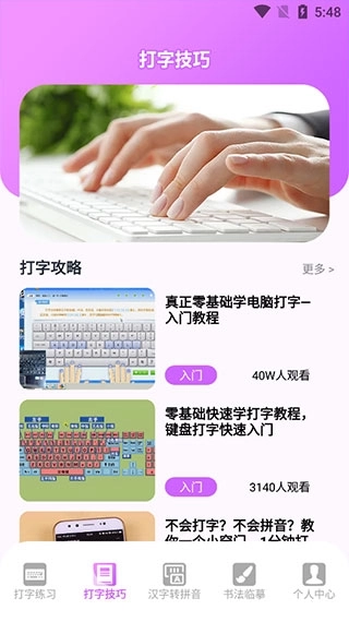2、打字技巧:打字高手整合了多样的打字攻略与教程,包含拼音输入法和五笔输入法。