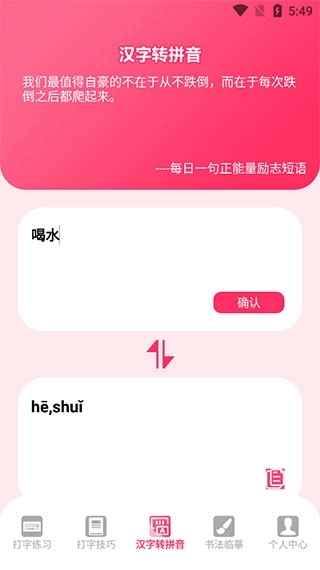 4、第三页的功能是“汉字转拼音”,你可以在页面上方的格子里输入“喝水”这两个字,接着点击“确认”按钮,这样页面底部就会显示出对应的拼音了。