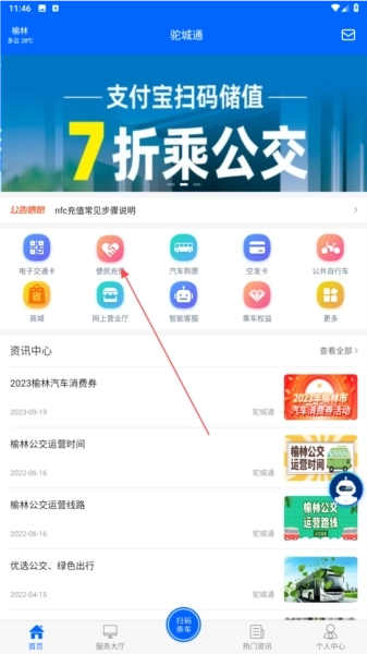 1、进入驼城通首页后,点击【便民充值】选项,即可开展公交卡充值相关操作。