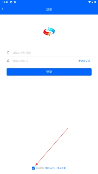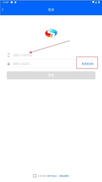 2、在登录界面的【请输入手机号码】处填写号码后,点击【发送验证码】按钮。