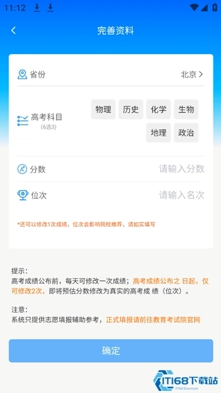 4、接着选择高中选修的三个科目,再填写高考分数与位次,全部填写好后点击确定按钮。