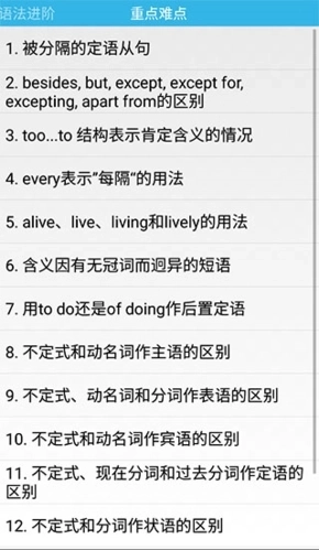 Grammar是一款专注于助力用户高效掌握英语语法的软件。它不仅为用户详尽讲解了各类英语语法知识,还提供了丰富的英语基础内容以及重点难点解析,能帮助用户快速获取所需的英语知识。软件内的每一项语法讲解都十分细致,便于用户快速牢记各个知识点,堪称学习英语的得力助手。