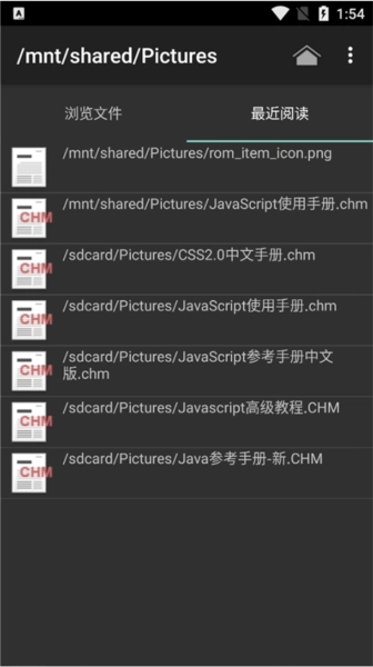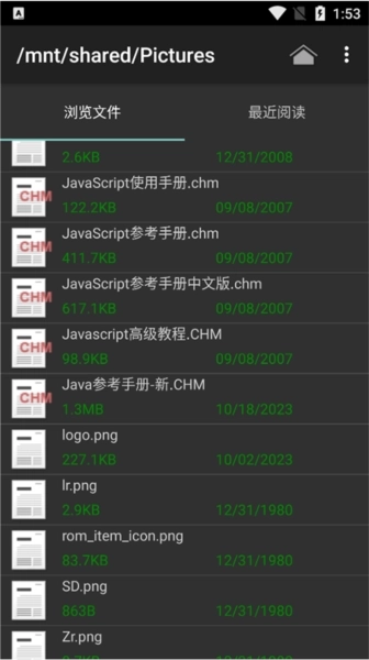 1、打开App后,在文件浏览界面挑选需要打开的文件,该文件不仅支持Chm格式,还兼容Jpg和Txt格式。