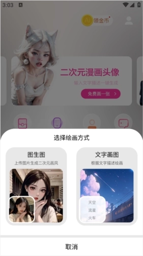 2、这里提供图生图和文字生图两种绘画模式,本次选择图生图模式进行创作。