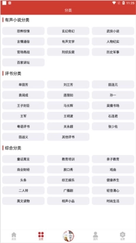 2、通过分类进行寻找:在底部点击“分类”,便会出现“评书分类”,根据用户喜好和需求选择评书讲解员。